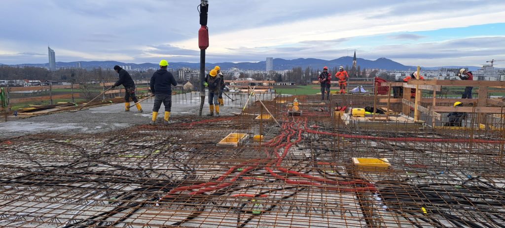 Kurz vor der verdienten weihnachtlichen Arbeitsunterbrechung wurde im Bauteil A die Bewehrung der Bodenplatte hergestellt. Die Betonarbeiten konnten trotz der immensen Betonmenge von über 800m³. Innerhalb eines Tages fertiggestellt werden. Die Bodenplatte hatte über die Weihnachtsfeiertage genügend Zeit, um gut auszuhärten. Parallel dazu wurde bereits an den Sauberkeitsschichten, Bewehrungen und Traforäumen der anderen Bauteile gearbeitet. Die Bodenplatten der restlichen Bauteile werden in den nächsten Tagen errichtet, während bei Bauteil A bereits die ersten Kellerwände errichtet wurden.
