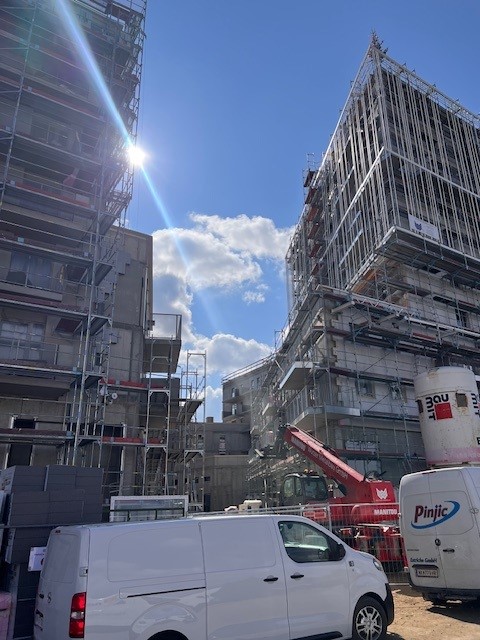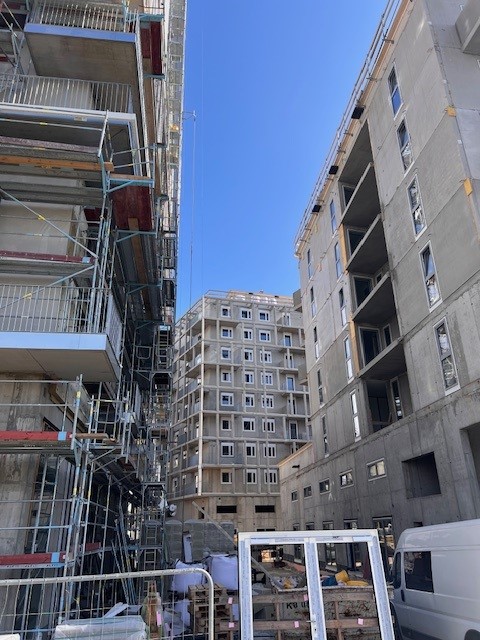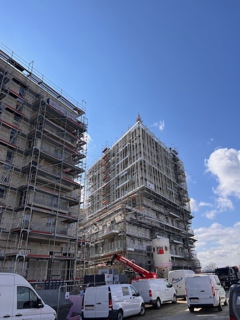 Die letzten Monate im Projekt An der Schanze 25 waren sehr arbeitsintensiv. Sowohl direkt auf der Baustelle ging es Schlag auf Schlag mit den Rohbauarbeiten voran als auch intern mit einer sehr starken Nachfrage unserer noch verfügbaren Wohnungen. Für die Bauteile A-B-D wurde bereits Anfang November der Meilenstein Rohbau/Dach dicht erreicht. Parallel dazu wurde bereits ein Großteil der Fenster eingebaut sowie die Arbeiten für den Meilenstein Rohinstallationen intensiv vorangetrieben. Die Trockenbauarbeiten sind ebenfalls in allen drei Bauteilen weit vorangeschritten – die Wände sind teilweise bereits bis ins 6.OG beidseitig geschlossen. Weiters wurde in den unteren Geschossen auch bereits mit den Estricharbeiten begonnen. Im Bauteil A ist der Estrich mittlerweile bis ins 6.OG gelegt. Insgesamt ist der Baufortschritt perfekt im Zeitplan. Die Planungen der öffentlichen Einbauten sind abgeschlossen und auch bereits überwiegend realisiert. Derzeit sind die Zeitpläne für die finalen Straßenbauten in Abstimmung. Wir gehen von einem weiteren zügigen Baufortschritt aus.